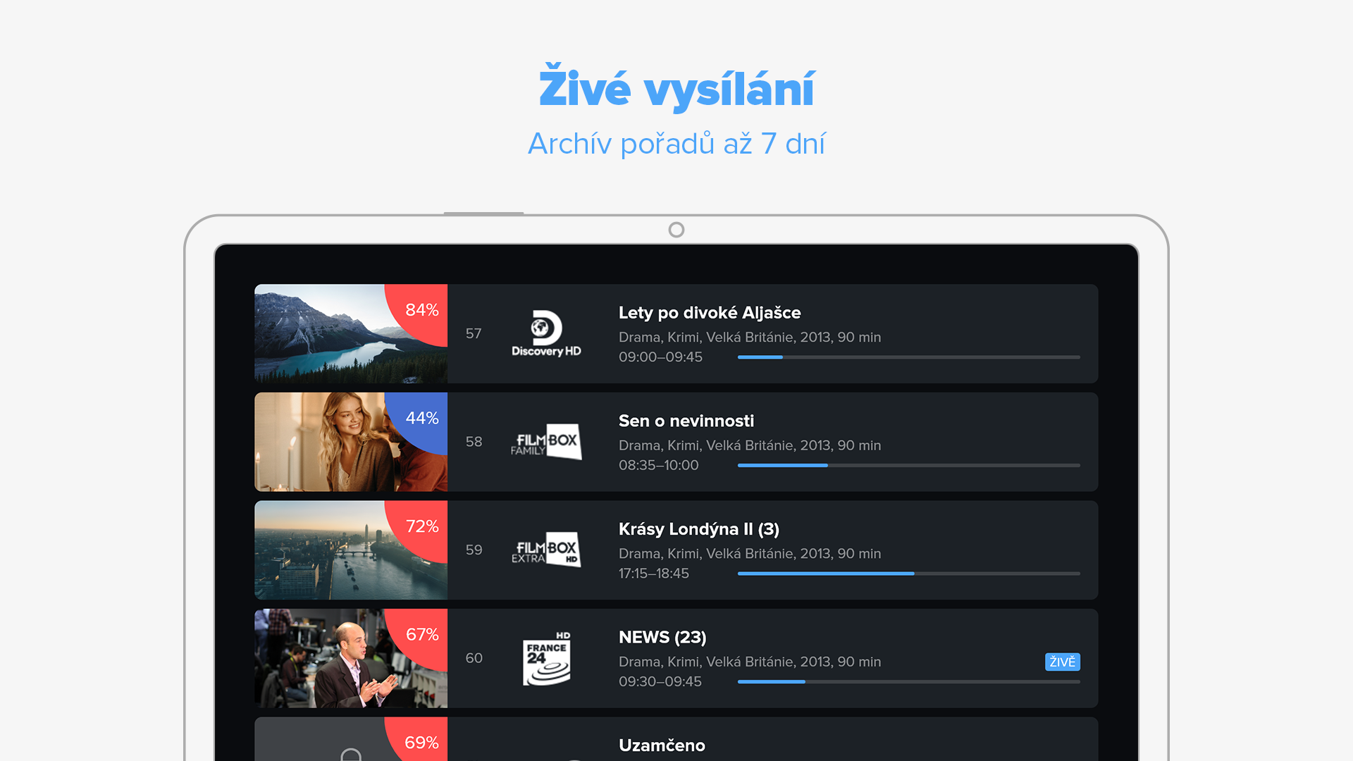 Aplikace pro Smart TV, chytrý telefon, tablet, set-top box (Arris, Albis), na webu (Chrome, Safari, Opera, Firefox, Internet Explorer).